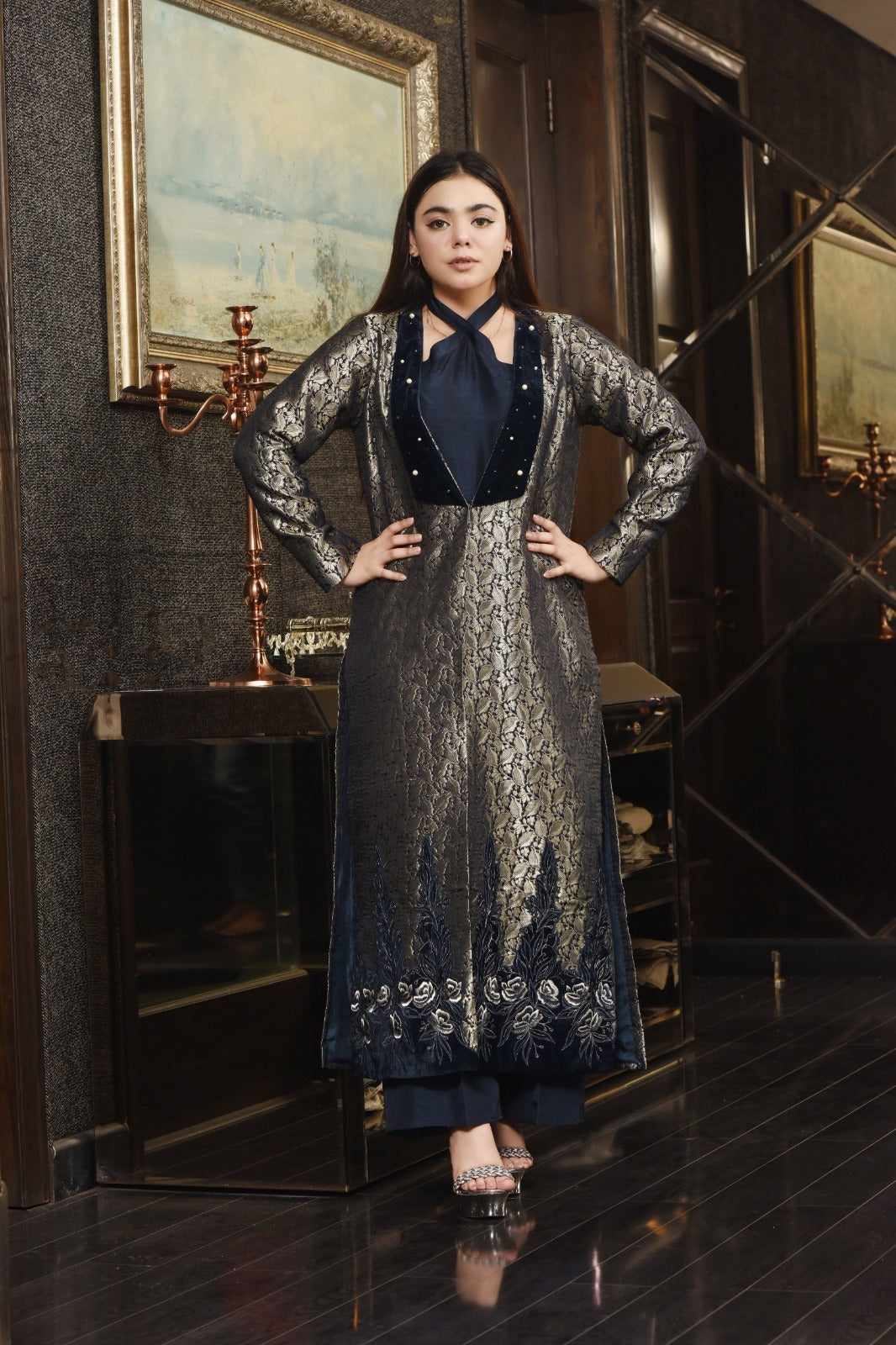 Luxuriously crafted with velvet patchwork and machine embroidery, embellished with pearls for a sophisticated look.