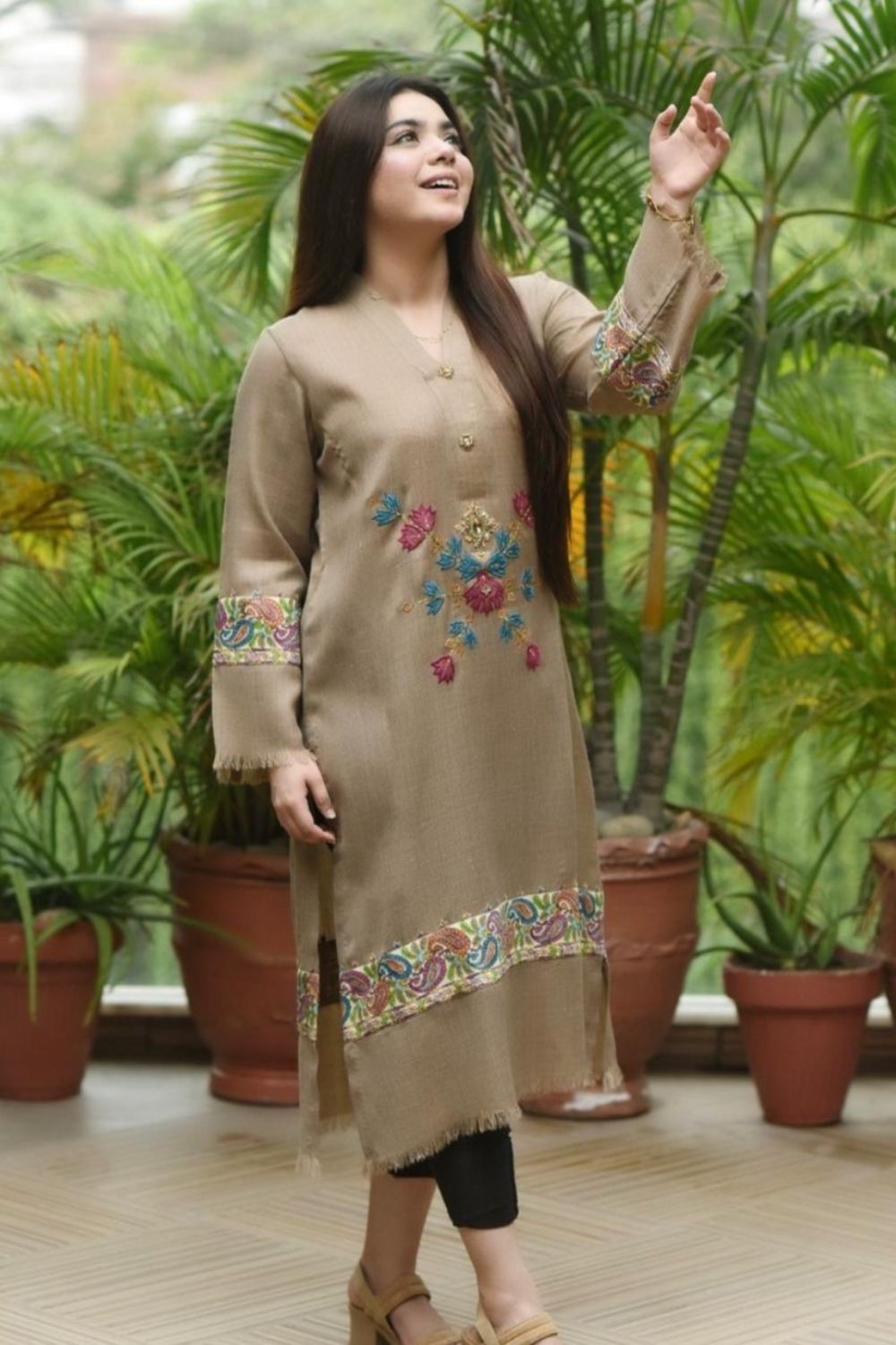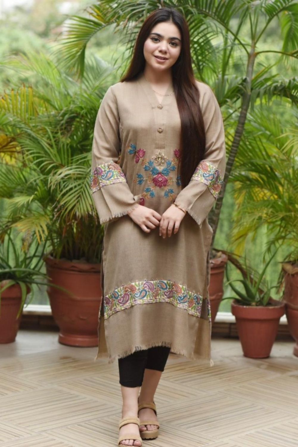 Crafted from luxurious Pashmina, this design features intricate machine patchwork and embroidery, elegantly accented with adda hand work.