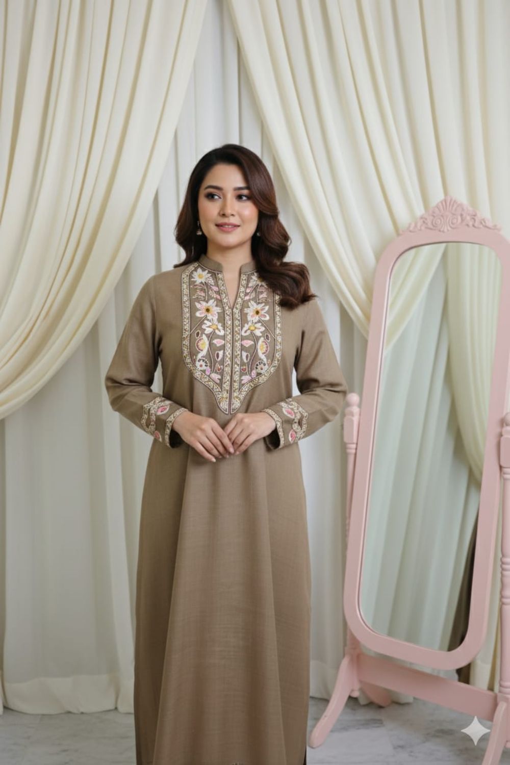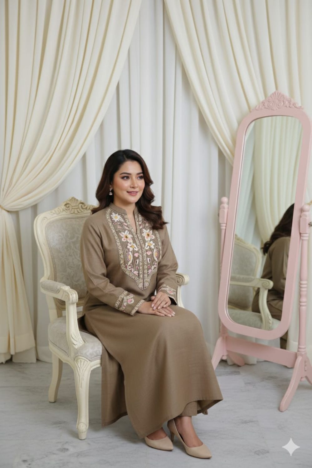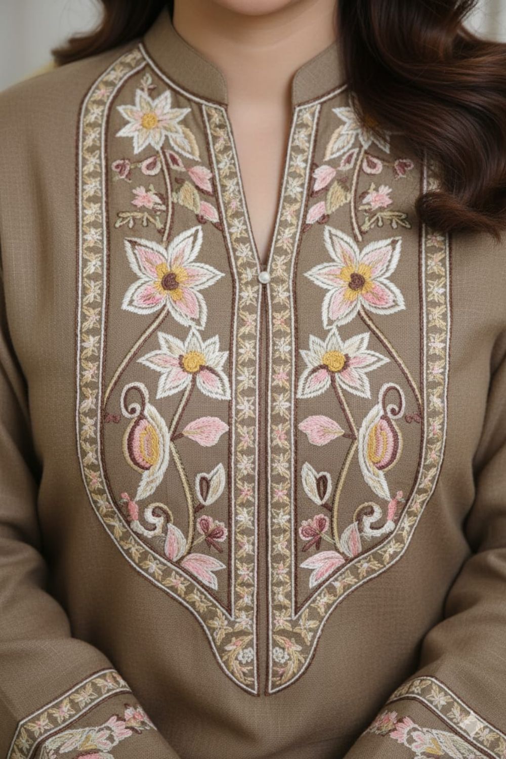 This kurta is beautifully adorned with Ari work on pure pashmina fabric.