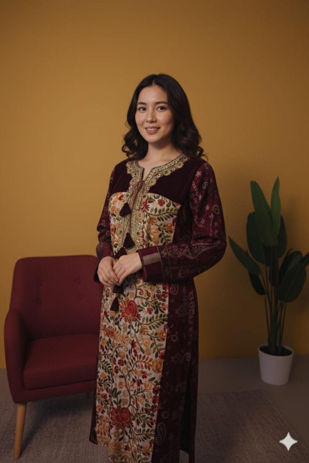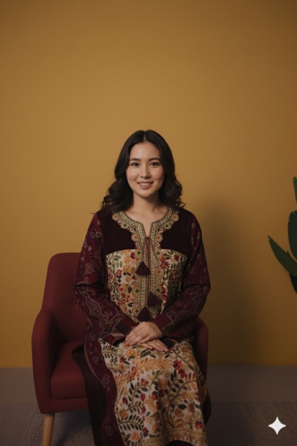 This versatile shirt is designed with pashmina, velvet and adorned with dabka, thread, beads and stones all sewed with hand.